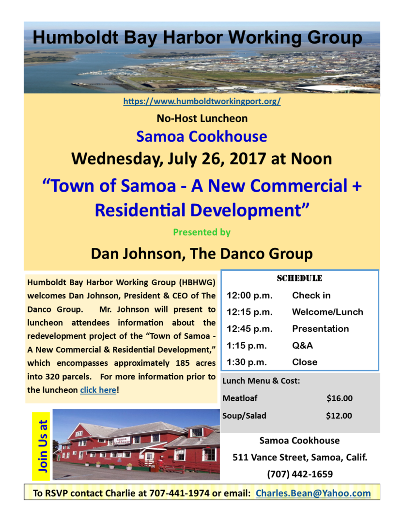 EUREKA-- Humboldt Bay Harbor Working Group (HBHWG) welcomes, Dan Johnson, President & CEO, of the Danco Group. Mr. Johnson will present information on the proposed plan for the “Town of Samoa – A New Commercial & Residential Development” project.