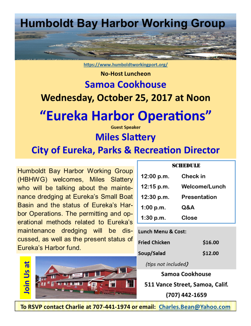 Eureka--The Humboldt Bay Harbor Working Group’s monthly luncheon for October will be held Wednesday, October 30.